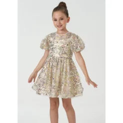2Bunnies Christmas New Year Holiday Girl Gold Shimmer Sparkle Sequin Dress Puff Sleeve
