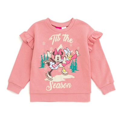 Cozy up in Disney style with this Minnie Mouse fleece sweatshirt and pants set, perfect for cool-weather days. The long-sleeve graphic top features glittery details and playful drop-shoulder sleeves, while the jogger-style pants offer a comfy elastic waist, ankle cuffs, and a secure drawstring fit. Soft and warm, this set is ideal for school, play, or holiday festivities, keeping kids snug while showing off Minnie’s timeless charm.