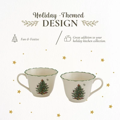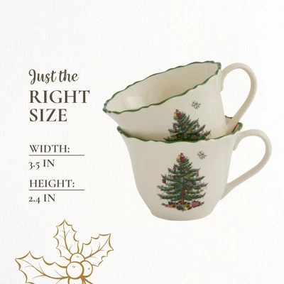The Spode Christmas Tree Collection Punch Cups offer the perfect blend of elegance and functionality for your holiday gatherings. These Festive Mugs feature a classic Christmas design, including holly leaves and a gentle scalloped rim, making them the ideal drinkware for cozy celebrations. Whether you’re enjoying a quiet cup of tea by the fire or hosting a festive gathering, these 8-ounce cups bring a touch of holiday charm to every occasion. Crafted from fine porcelain, these Ceramic Holiday Mugs are built to last. They’re microwave, dishwasher, oven, and freezer safe, offering versatility and ease of use without compromising style. The generous 8-ounce capacity is perfect for serving coffee, tea, espresso, or even hot cocoa during cold winter nights.The Christmas Mugs are designed to pair beautifully with the full line of Spode Christmas Tree Collection items. Mix and match them with plates, bowls, and other holiday accessories to create a festive and personalized table setting. Their timeless design ensures that they’ll be enjoyed for many holiday seasons, making them a valuable addition to your holiday decor.Great for gifting, these Holiday Mug Gift Sets come in a set of two, making them the perfect present for friends, family, or even yourself. Whether you’re adding to your own Spode collection or sharing the joy of the holidays with others, these mugs will bring warmth and cheer to every home. Add a touch of tradition and elegance to your home this holiday season with the Spode Christmas Tree Collection Punch Cups. Whether you’re serving espresso, coffee, tea, or hot chocolate, these Winter Mugs will make every sip a festive one.