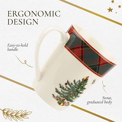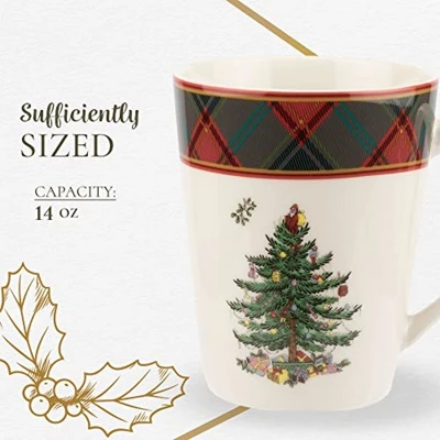 - 14 Ounce Mug: A perfect complement to Spode Christmas Tree or the start of a new collection. Inspire merry celebration with our festive Christmas Tree Tartan Mug. This 14 ounce mug is embellished with a generous tartan border and the iconic Spode Christmas Tree. This mug is great for serving everything from coffee and tea to hot chocolate and apple cider. Easy care, this collection is dishwasher, microwave, and freezer safe.